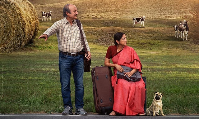 The poster shows Anupam and Neena as a married couple stranded in a village with cows grazing in the background. Anupam seems to be asking for a lift as Neena sits with the luggage. A pug-breed dog is also accompanying them.