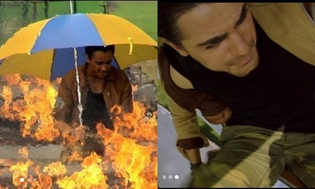 Out of the three photos shared by the actor, one shows him amidst a raging fire, while the other two show him hanging from a jet in motion. Revealing that his eyelashes were actually burnt during the shoot, the actor wrote, "Speaking of Luck... I found these old pictures and thought they would be interesting to share. Yes, that's real fire. The umbrella helped with the sun, but not the flames. My eyelashes actually got burned off during a take, when an explosion went off too close in front of me. And yes, that's also really me strapped to the outside of a flying Cessna."