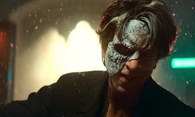 The prevue opens with different shots of people running in a frenzy, in a village and at a metro station. Shah Rukh Khan’s voiceover ensues, “Who am I? Who am I not? I don’t know.” We see glimpses of SRK, spying on a guarded truck via binoculars, making a grand entry in khakis, leading a battalion in camouflage and supporting himself on a rifle as he sits with half his face in a grey mask. “Ready?” he asks.