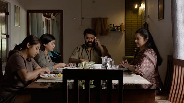 Days after starting production on the third instalment in the Drishyam franchise, writer-director Jeethu Joseph dropped a frame from filming that gives a first look at the film's characters. In the frame is Georgekutty (Mohanlal) and Rani (Meena) as well as their two daughters, played by Esther Anil and Ansiba Hassan, having food at a table. Jeethu also shared similar stills from the franchise's first and second parts alongside this one, captioning the post, "Drishyam Table Trilogy".