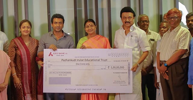 Actor Suriya has donated a sum of ₹1 crore to the Pazhankudi Irular Trust. Suriya has met the Chief Minister of Tamil Nadu, MK Stalin, along with his wife, actor Jyotika to hand over the cheque to Pazhankiudi Irular Educational trust. Justice Chandru, whose life events inspired Suriya's latest outing, Jai Bhim, filmmaker Tha Se Gnanvel, and members of the Pazhankudi Irular Trust were also in attendance.