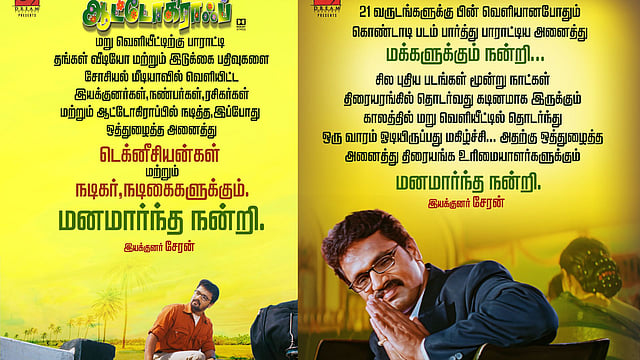 In the note, Cheran wrote that these days even new films do not run in theatres after three days of their release, but people have given an overwhelming positive response to Autograph, making it run in screens even after a week. He also thanked theatre owners for their cooperation and expressed gratitude to the cast and crew of the film, and to those directors and actors who urged fans to watch the film.