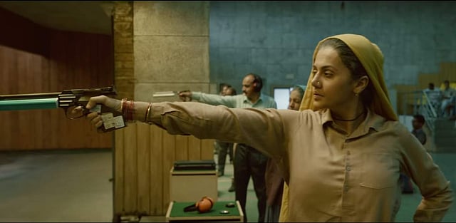 The teaser opens with a voiceover. A little girl narrates the story of her grandmothers, who emerge on screen with pistols in hand. We cut back to a scene of armed men posing before a camera, with young Chandro and Prakashi standing in their mist. There are flashes of a shootout, with women getting shot and a medal hitting the floor. In the present, the gun-toting grannies are seen perfecting their skills, with Doctor (Vineet) assisting them. The teaser also stops to translate the title — which means bull’s eye.